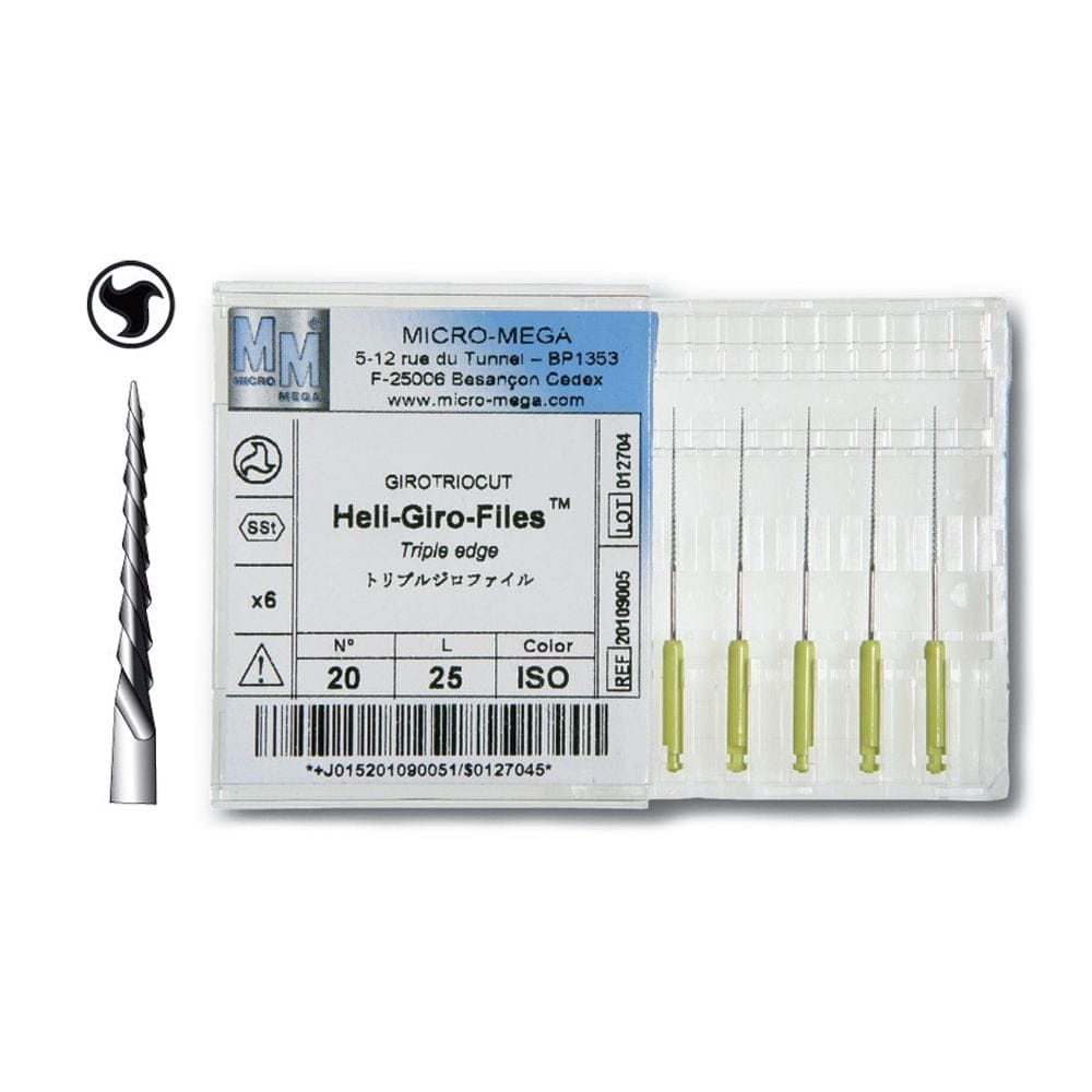 Les Heli Giro Files de Micro-Mega sont des instruments endodontiques manuels destinés à la préparation et au débridement des canaux radiculaires. Conçus selon une géométrie spécifique, ces limes combinent les caractéristiques de diverses techniques traditionnelles pour offrir une progression contrôlée dans le canal, facilitant l’accès, l’élargissement et le nettoyage de la voie radiculaire. DocNum