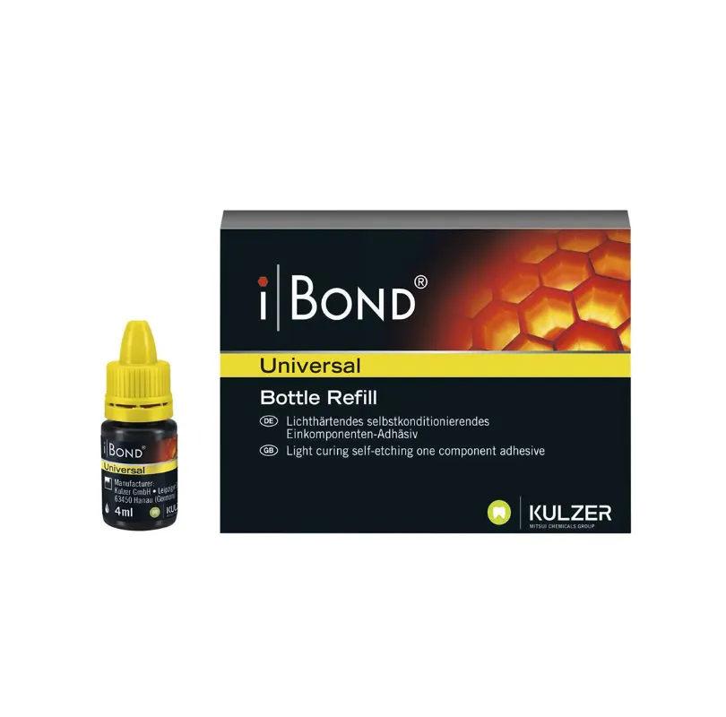 iBond Universal est un adhésif dentaire universel de la marque Kulzer, conçu pour couvrir toutes les techniques de mordançage : self-etch, total-etch ou mordançage sélectif. Grâce à sa formulation avancée, il garantit une adhésion forte et durable sur l’émail, la dentine ainsi que sur une large variété de matériaux indirects (métal, céramique, composite).