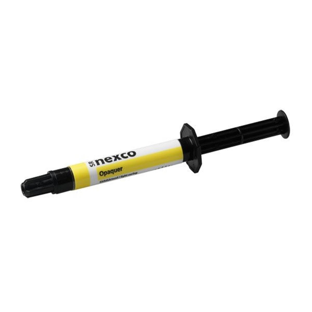 SR Nexco Opaquer est un composite opaquant de haute qualité destiné à être utilisé comme couche de masque ou de blocage lors de restaurations esthétiques. Il sert à corriger ou masquer des zones avec des colorations sous-jacentes (taches, ombres, résines anciennes, zones métalliques ou limites de teintes) avant l’application du composite de restauration définitif.