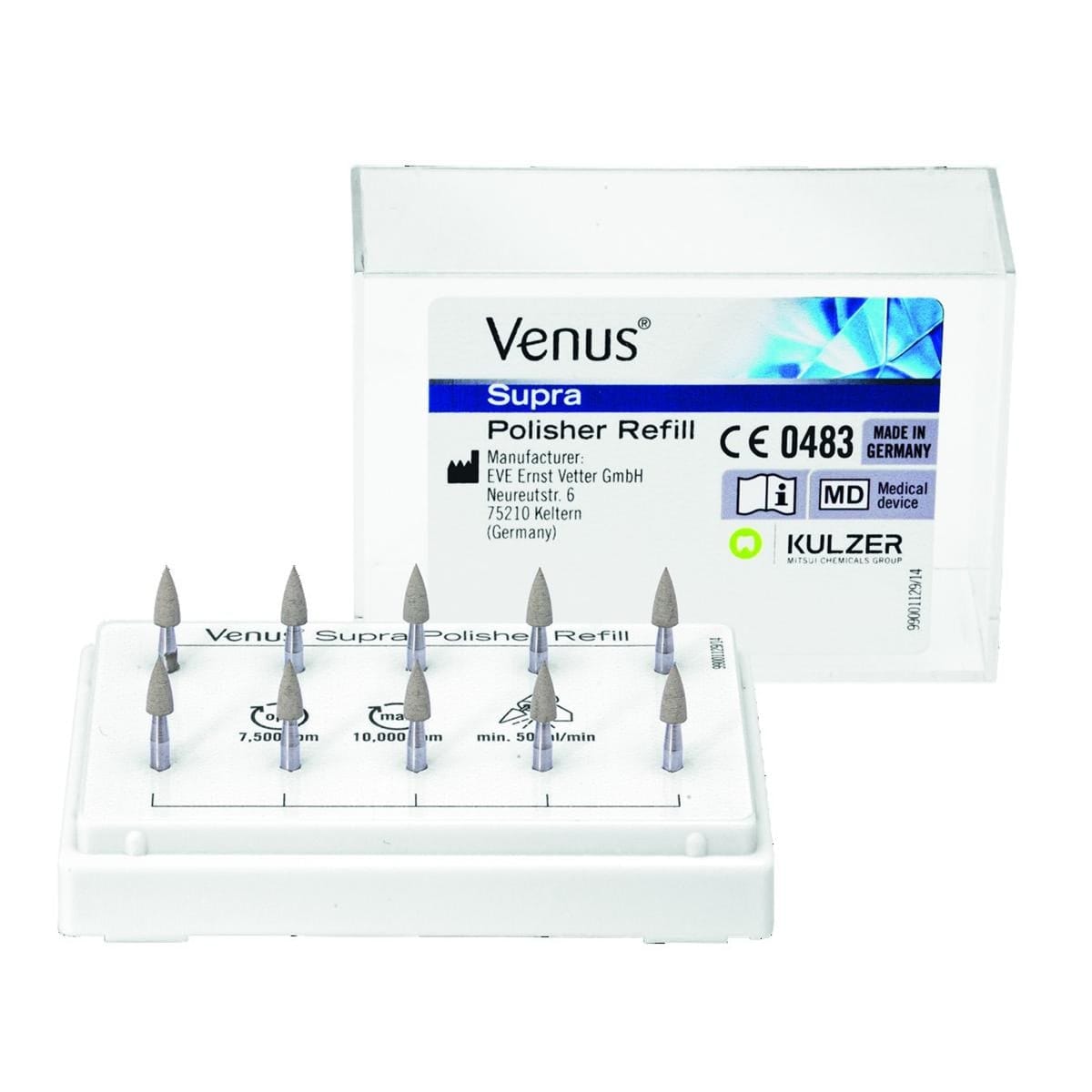 Venus Supra Refill est un système de polissage haute performance conçu pour obtenir une surface lisse, brillante et durable sur les restaurations composites. Grâce à une combinaison optimisée de grains abrasifs et de matériaux flexibles, Venus Supra permet un contrôle précis du polissage, qu’il soit réalisé en phase d’ajustement, de pré-polissage ou de finition brillante.