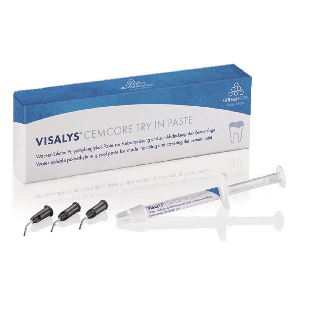 La Visalys CemCore Try-In Paste de Kettenbach est une pâte d’essai destinée à la simulation esthétique préalable avant le collage définitif avec le composite de scellement Visalys CemCore. Elle permet au praticien d’évaluer avec précision la teinte finale, l’intégration esthétique et l’harmonie de la restauration avant la cimentation définitive.